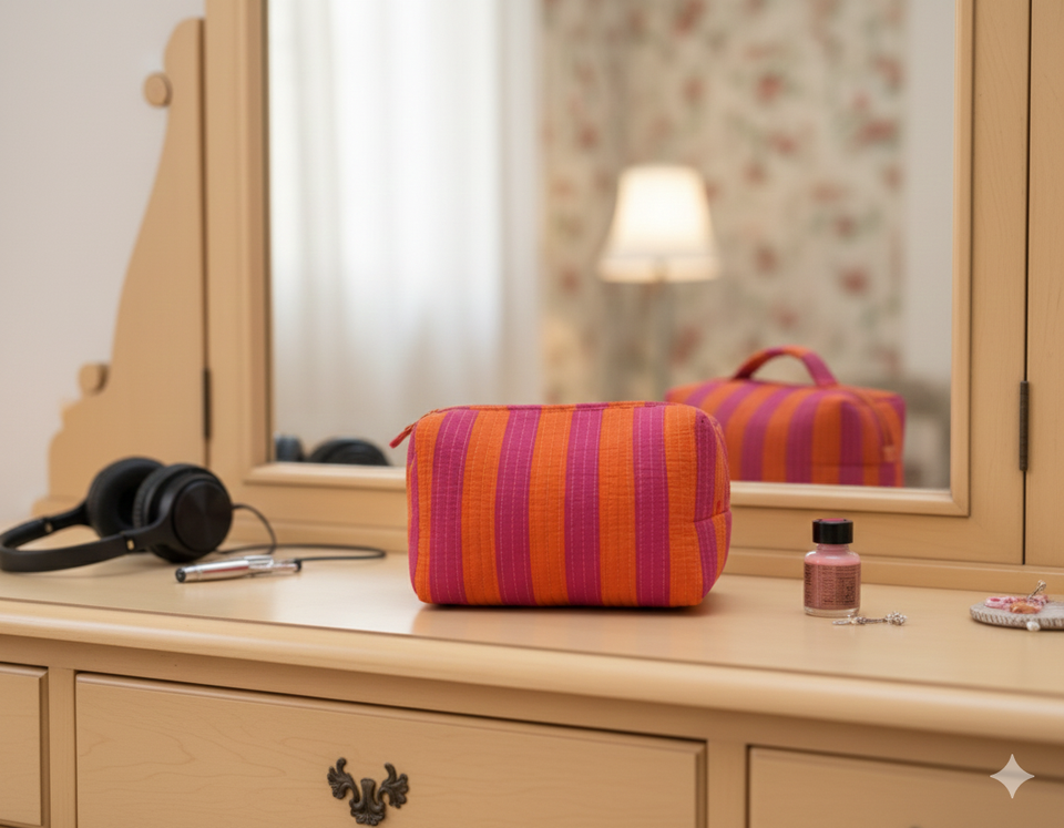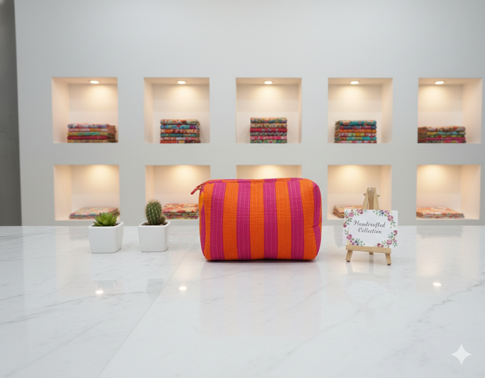 Le Souvenirs for Orange Vintage Quilted Cotton Handblock Water Resistant Travel Vanity Pouch Zipper Closure Inner Cosmetic Case