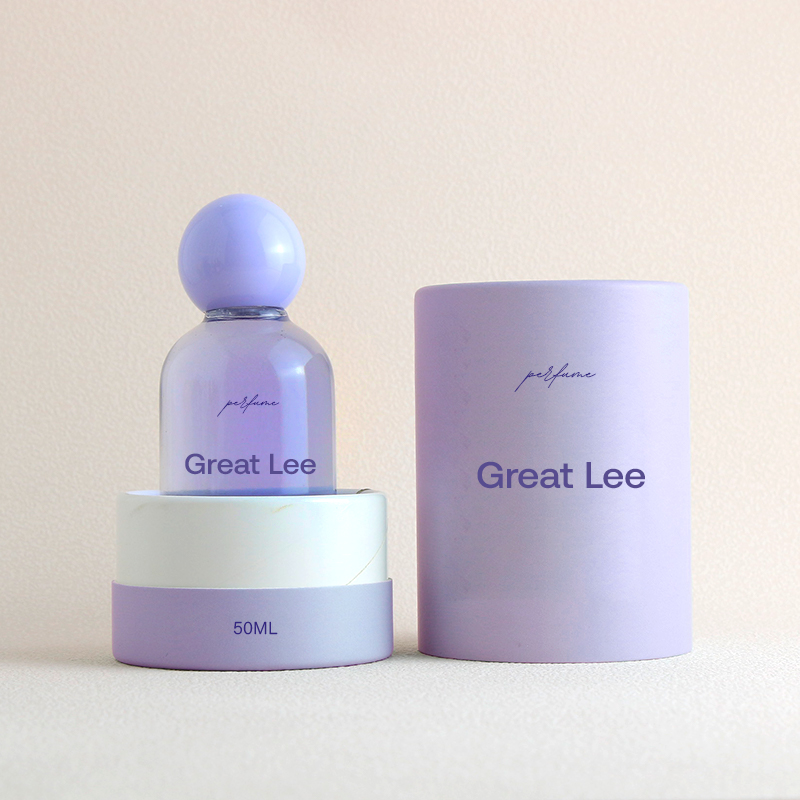 Leak proof Durable Hot stamping Cylindrical classic purple empty glass perfume bottle and paper box