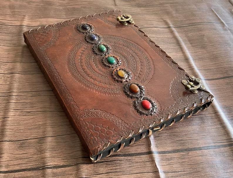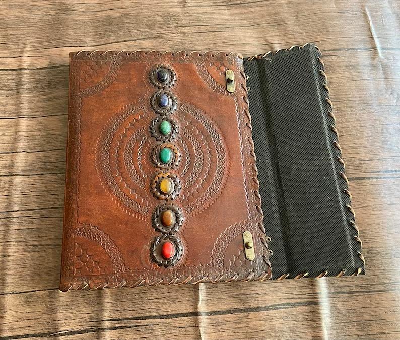 Leather Book of Shadows Journal Supernatural Notebook with 7 Chakra Gem Stones Healing Grimoire Crystals and Latch