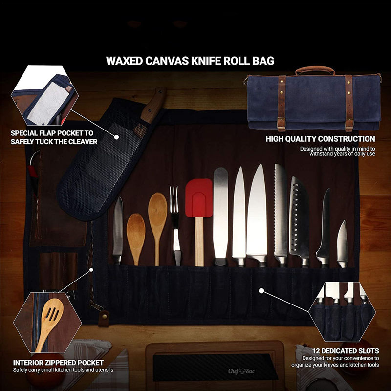 Leather Canvas Knife Roll Chef Tool Organizer Bag Heavy Duty Cutlery Storage Premium Kitchen Smell Proof Lightweight Comfortable