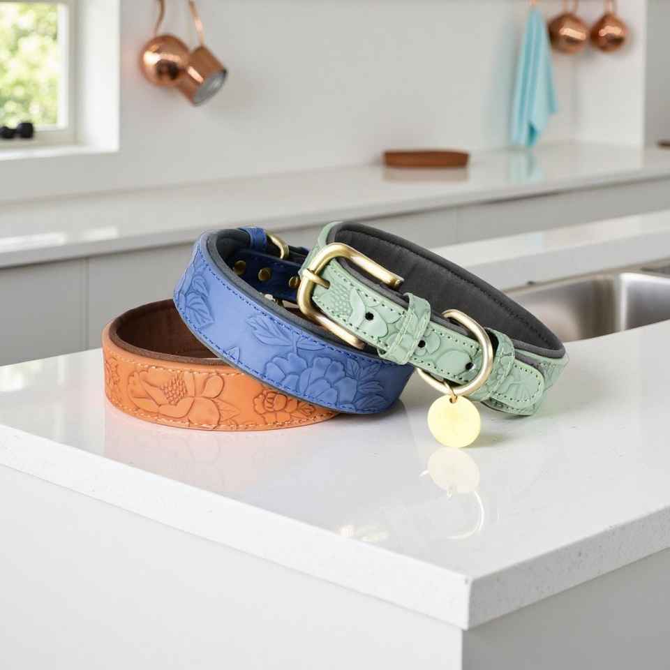 Leather Dog Collar With Personalized Name Tag Porcelain Floral Design Soft Padded Interior Adjustable Pet Accessory