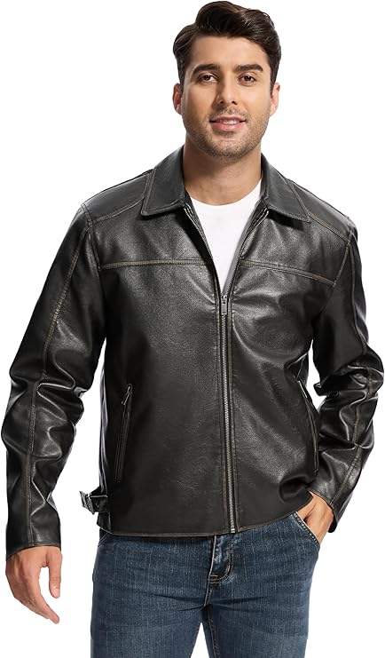Leather Jacket Men Faux Lightweight Bomber Jackets Men's Motorcycle Vintage Lapel Coats with Zipper and Pockets.