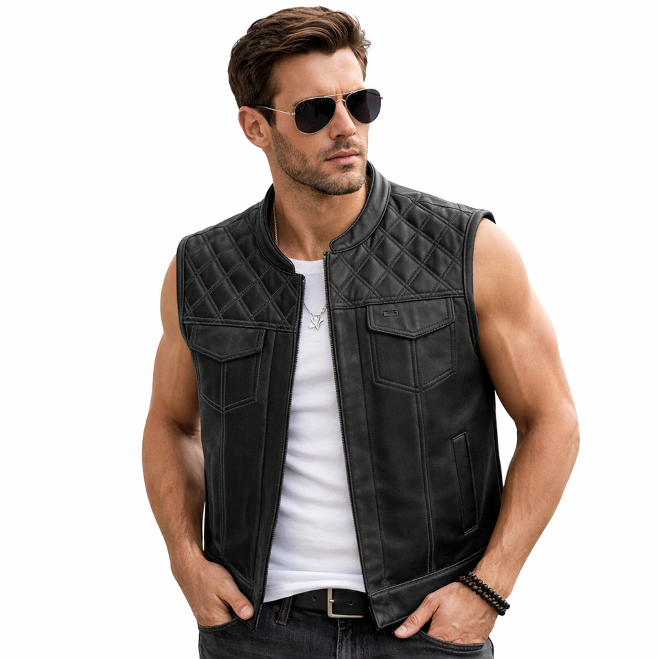 Leather Motorcycle Biker Vest with Custom Embroidery Breathable Summer Outer Wear Club Style