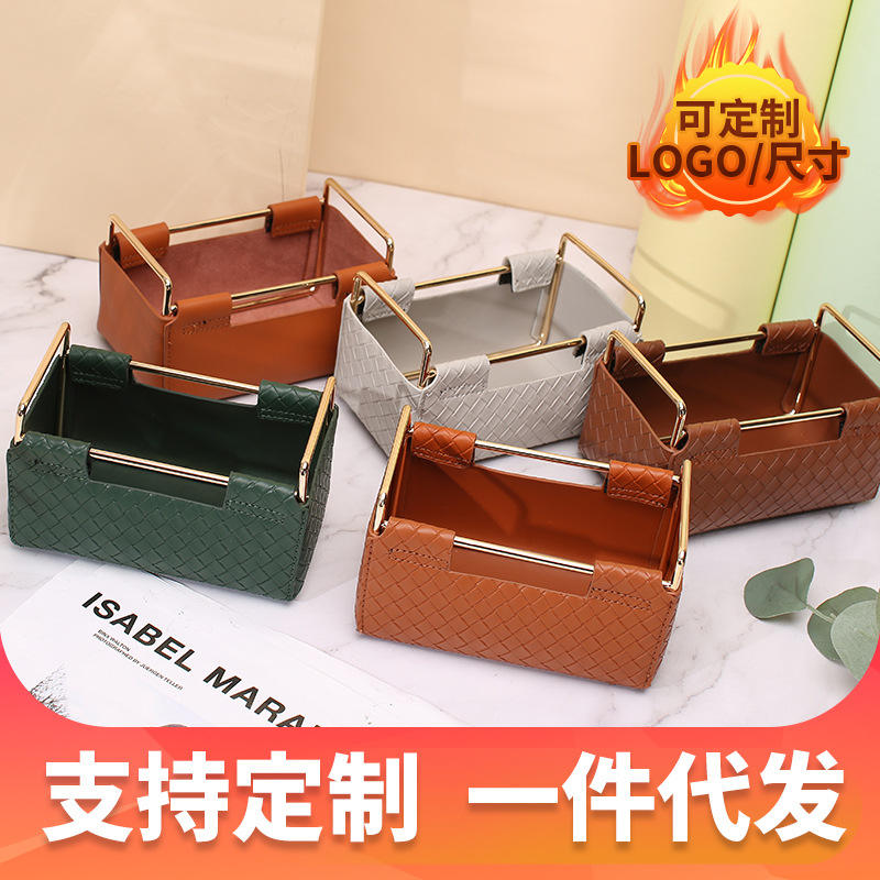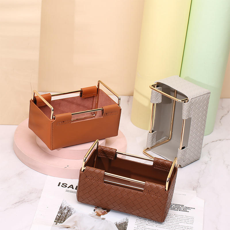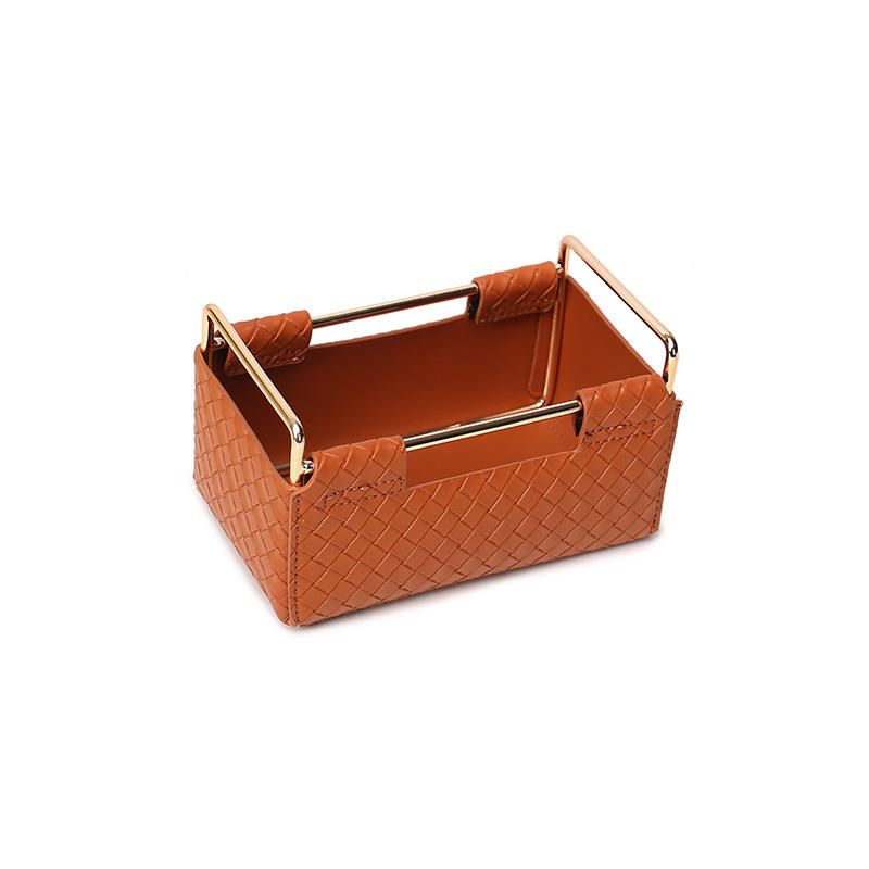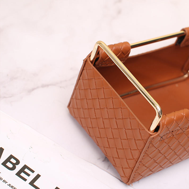 Leather Storage Box 2 Square Desktop Organizer Dark Brown Woven Pattern 2L Capacity Makeup Bag Stationery Holder