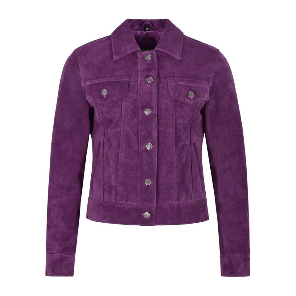 Leather Trucker Jacket for Women with Cow Skin Purple Suede Jacket for Vintage Style Real Leather Jacket