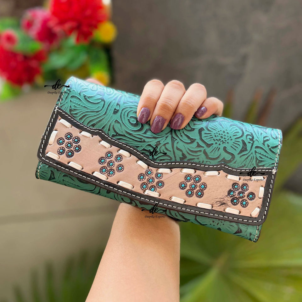 Leather Wallet Hand Tooled Carving Clutch Phone Case Card Stylish Turquoise Color Wallet Hot Sale Multi Uses Western Leather