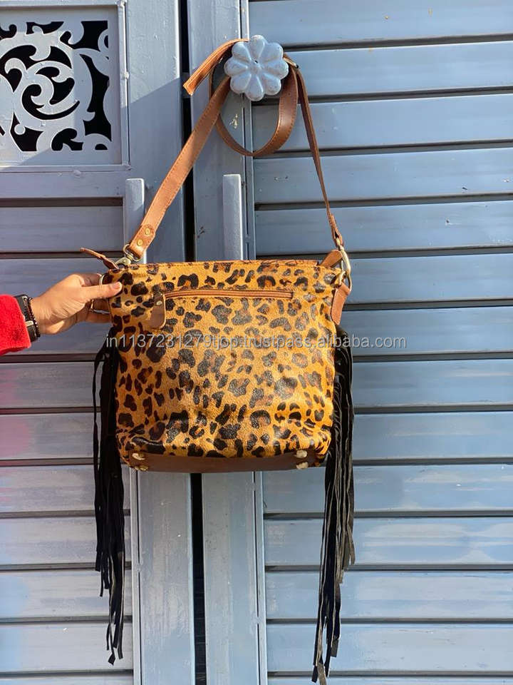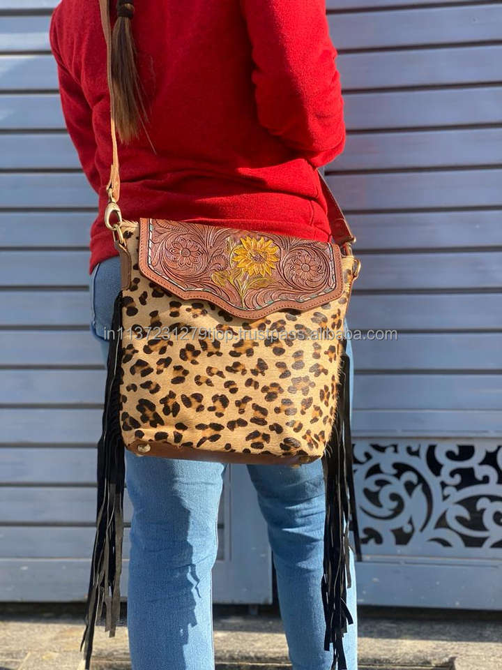 Leopard Fur Fringe Leather Handbag Tasseled Bag Tooled Leather Sling Bag Hot Selling Leather Purse