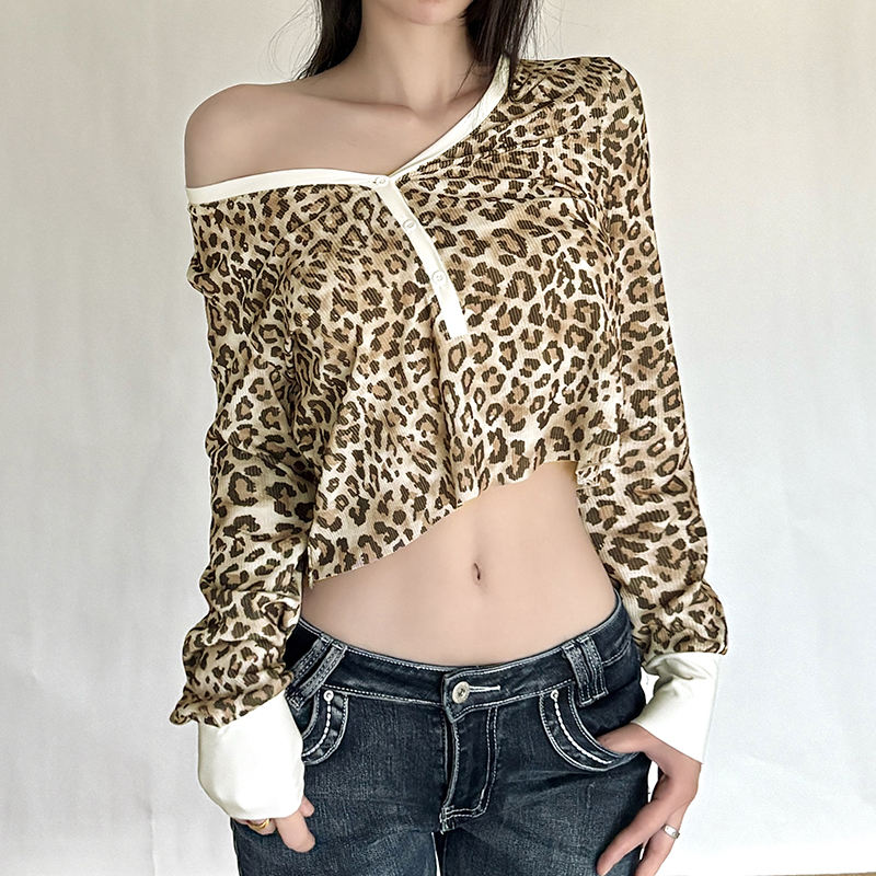 Leopard Print Cardigan Crop Top V-Neck Loose Long Sleeve T-Shirt Printed Button Casual Sexy