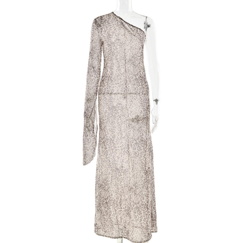 Leopard Print Sheer Off Shoulder Single Sleeve Slim Fit Long Dress For Evening Wear