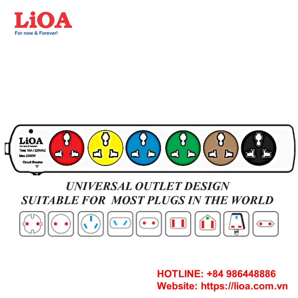 LiOA New Generation Universal Self Grounding Extension Socket 6 Outlets 2200W/10A 5 Meters CB Protected Compatible UK South