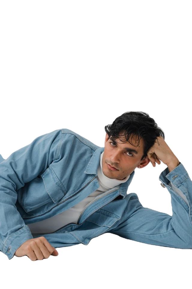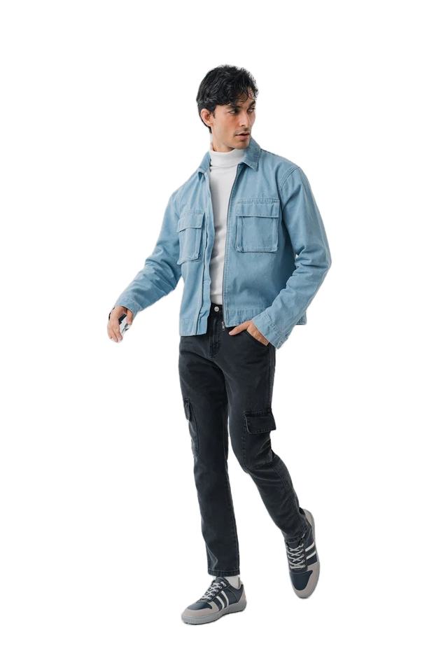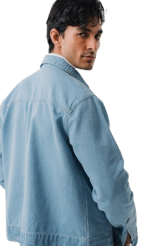 Light Blue Denim Zip Up Jacket for Men Premium Cotton Long Sleeve Outerwear with Dual Chest Pockets Fashion Casual Workwear