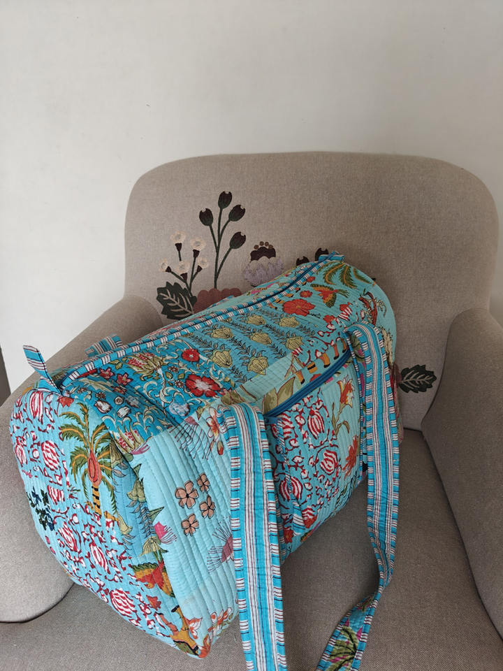Light Blue Handcrafted Eco-friendly Luxury Sport Floral Quilted Duffle Tote Bag Vibrant Patchwork Boho Travel Vintage Charm