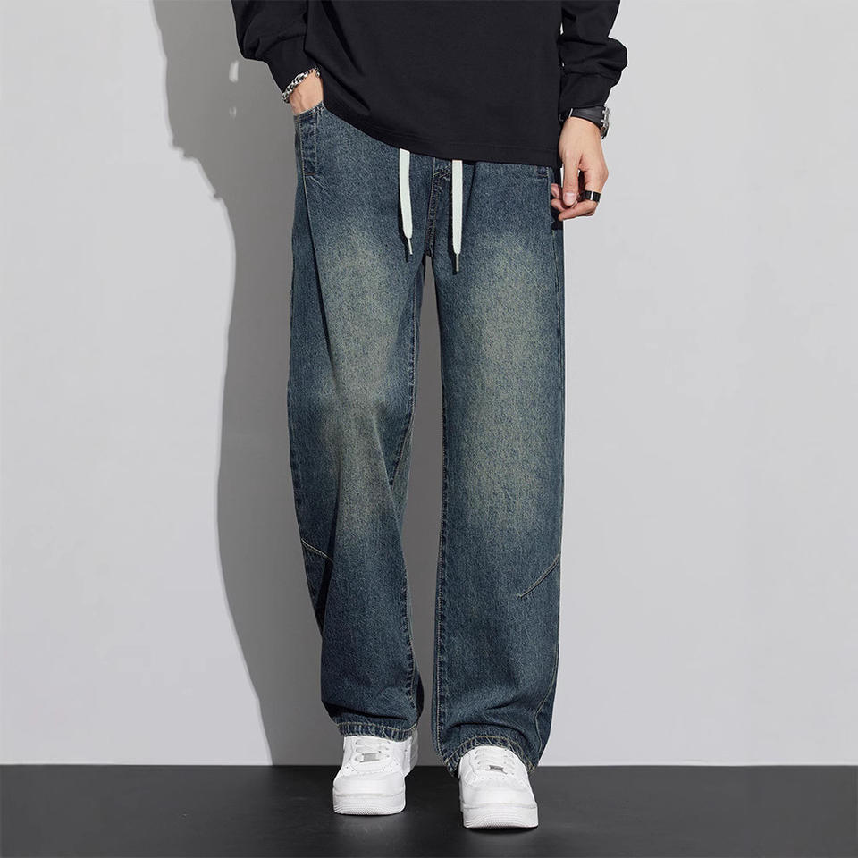 Light Blue Jeans Feature an Elastic Waistband Design, Straight-leg Silhouette, and a Minimalist, Versatile Style.