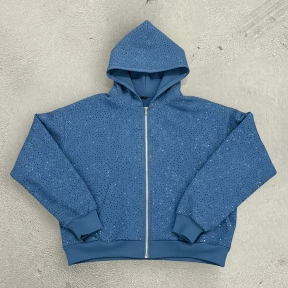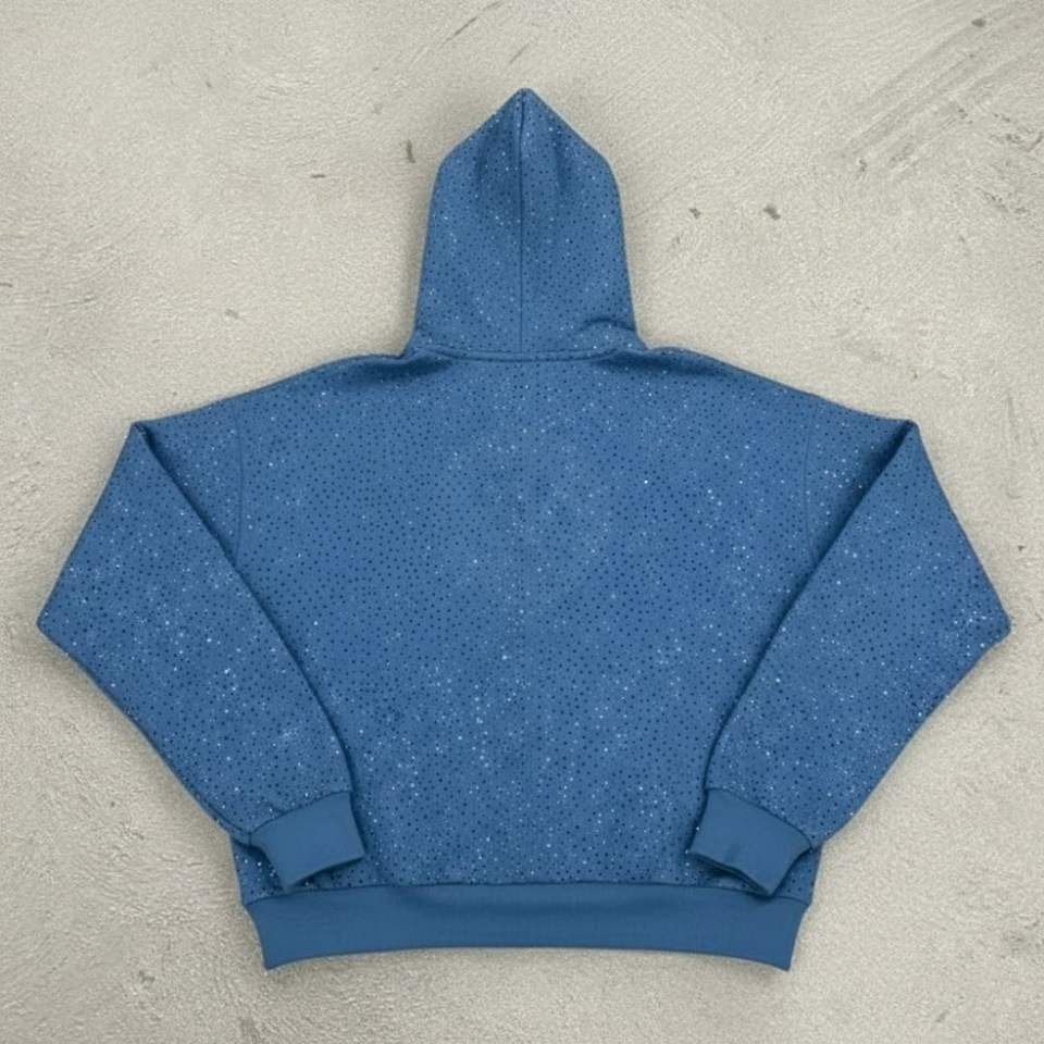 Light Blue Pullover Custom Logo Streetwear Rhinestone Hoodie Men Heavyweight 100% Cotton Winter Low MOQ 500 GSM