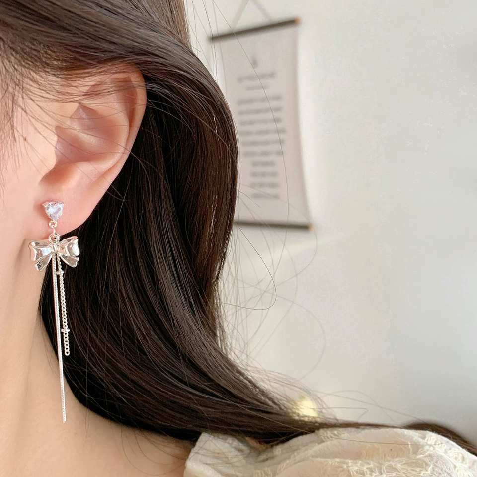 Light Luxury Premium Silver Bow Tassel Earrings Long Summer Korean Temptation for Ladies Wholesale Jewelry