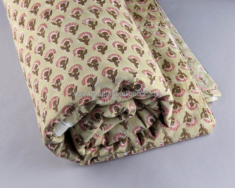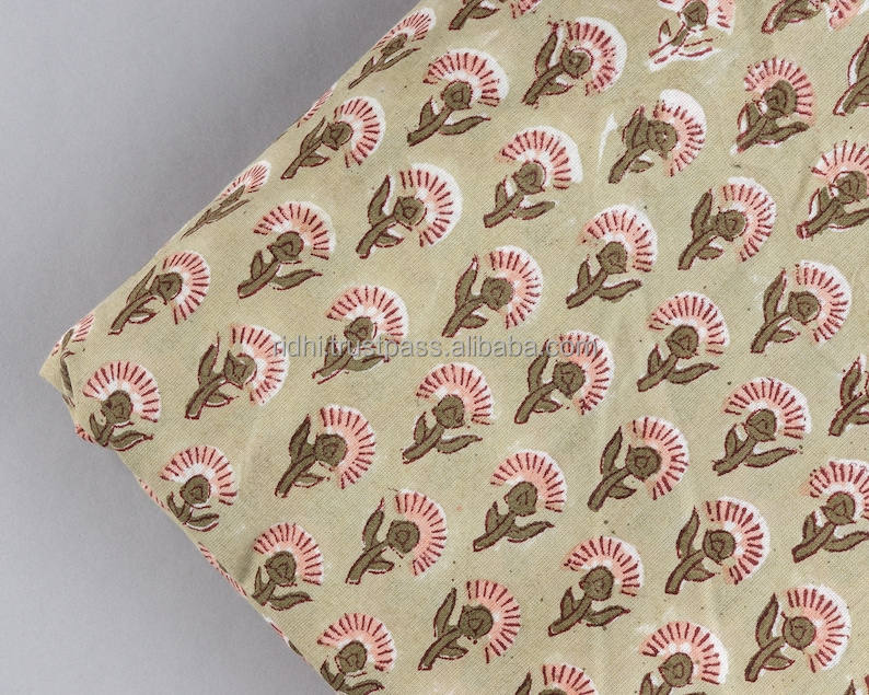 Light Moss Green Coral Pink Indian Floral Hand Block Printed 100% Pure Cotton Cloth Block Print Cotton Fabric India