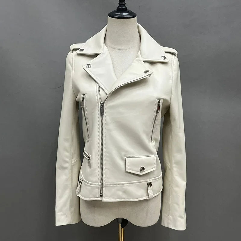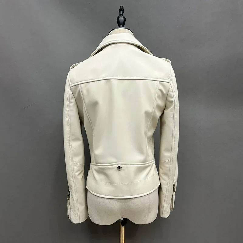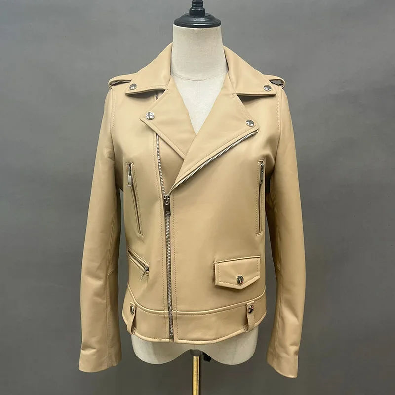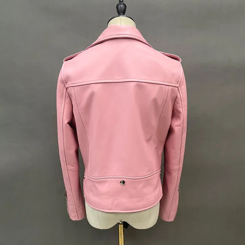 Light Pink Color Genuine Leather Jacket for Women Top Layer High Quality Leather Jackets Moto Racer Style Women Leather Jacket