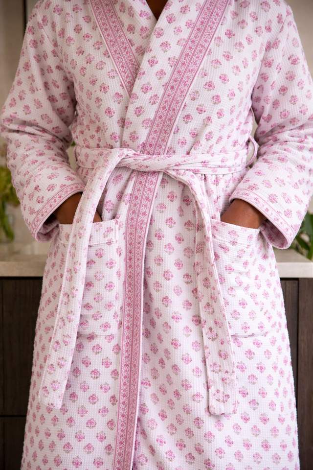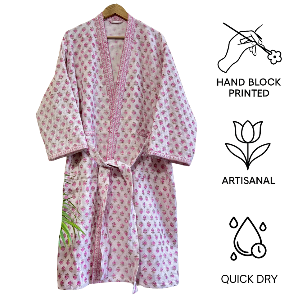 Light Pink Cotton Waffle Bathrobe Hand Block Printed Floral Women Quick-Dry Lightweight Compressed Eco-Friendly Hotel Robe