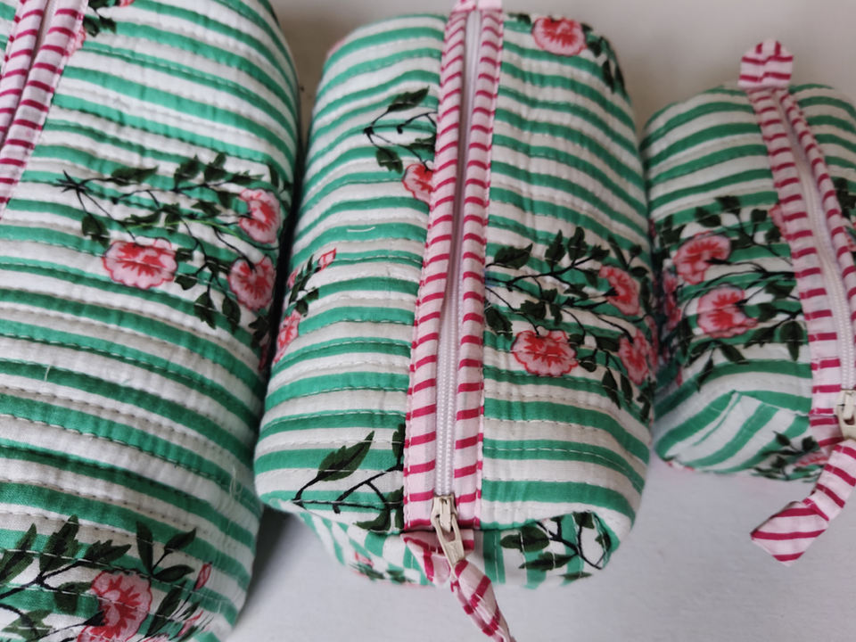 Light green Stripe Floral Block Printed Durable Cotton Zipper Makeup Bags Indian Pouches Travel Cosmetic Organizer Kit