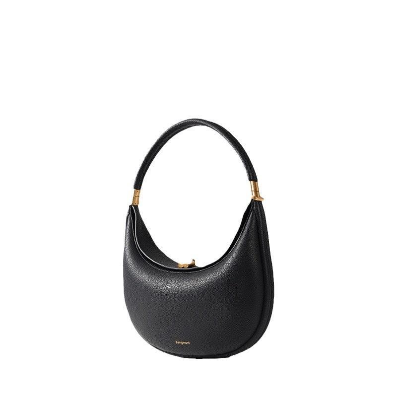 Light green leather crescent-shaped handbag with luxurious metal embellishments, a women's shoulder bag.