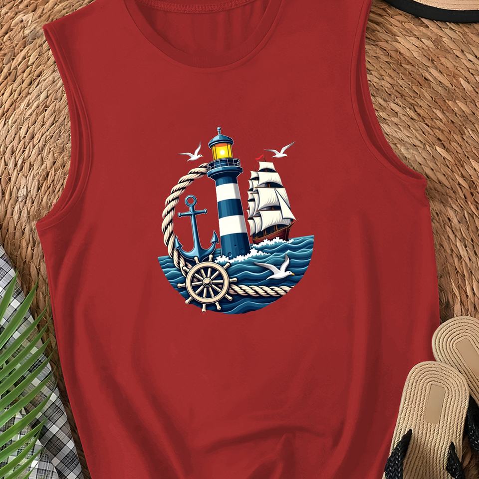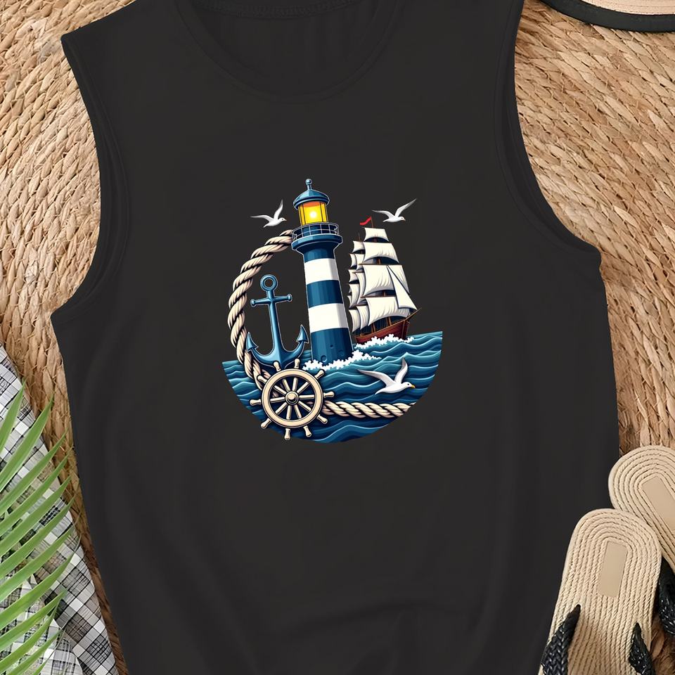 Lighthouse and Anchor Nautical Theme Women's Casual Vest with Knitted Fabric and Front Logo