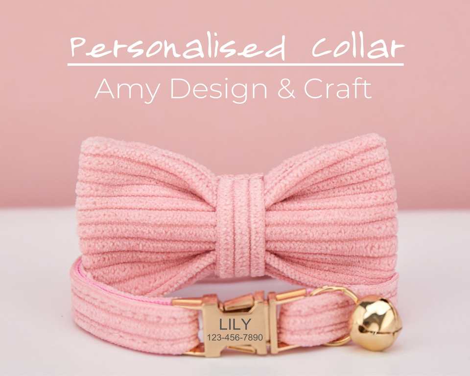 Lightpink Corduroy Personalized Cat & Small Dog Collar Bow Tie Leash Set,Free Engraved Kitten Puppy Name Tag Gold Bell,Pet