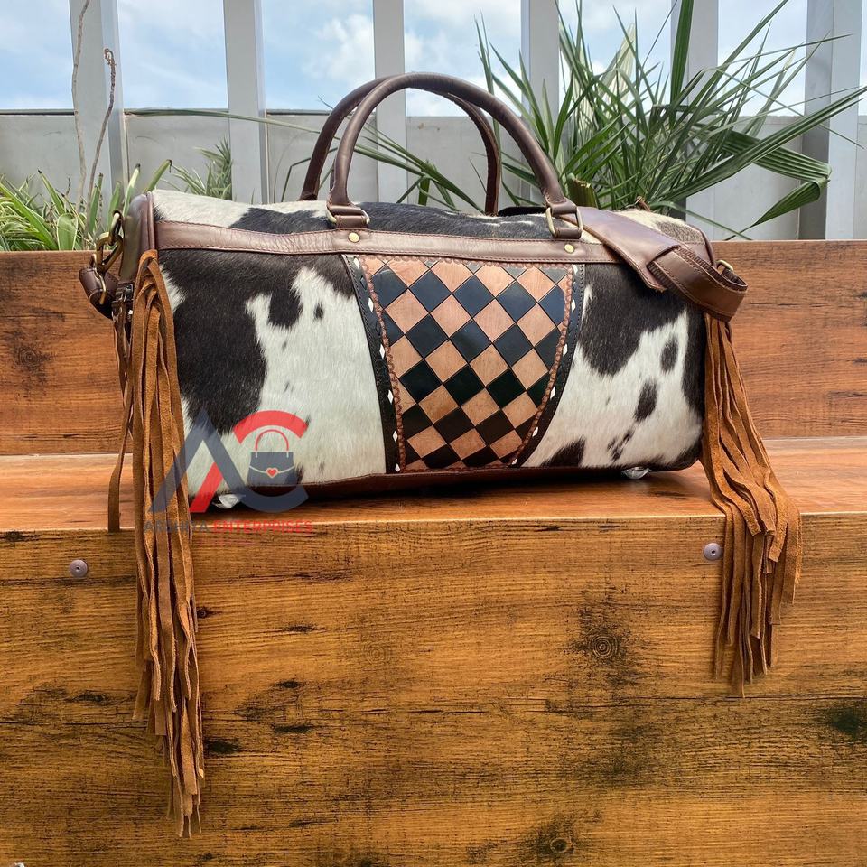 Lightweight High Quality Unisex Hand Tooled Leather Checkered Design Fringe Duffel Bag New Hair On Genuine Leather Travel Bags