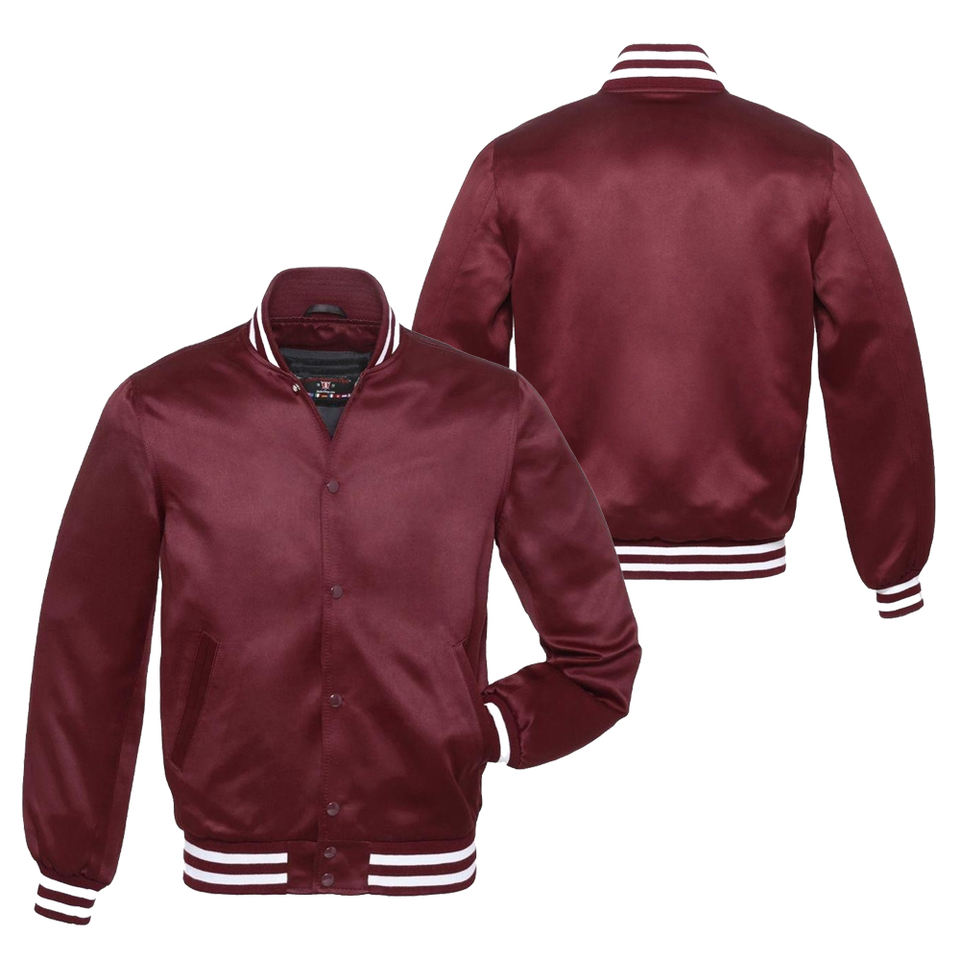 Lightweight Satin Silk Letterman Varsity Jacket For Men Maroon Ribbed Collar Stylish Custom Logo Men's Baseball Jacket