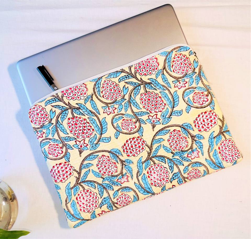 Lightweight Stylish Floral Hand Block Print Cotton Large Capacity Eco-Friendly Laptop Sleeve Vintage Style for Students Offices
