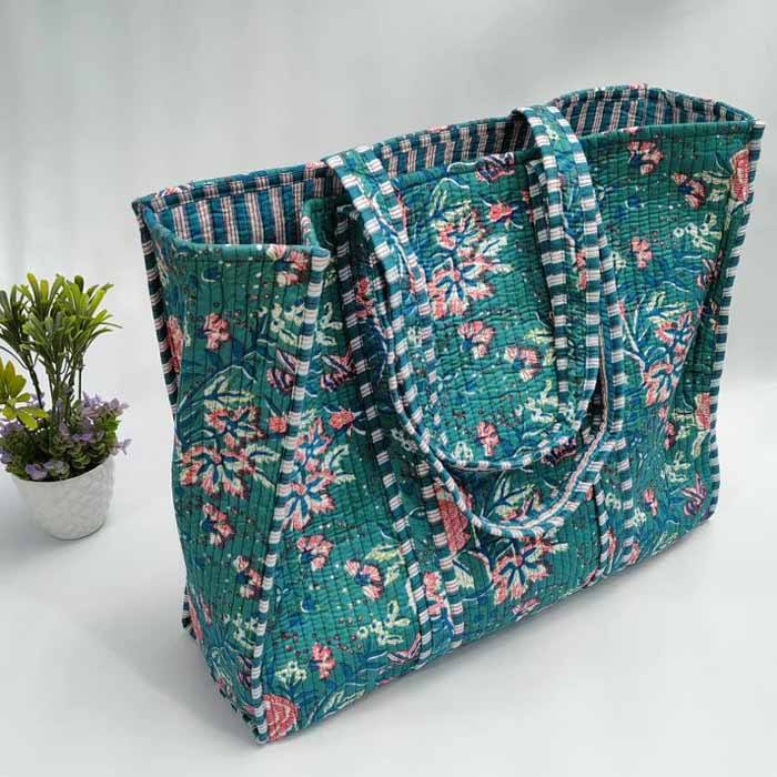 Lightweight Sustainable Shoulder Bag for Daily Use Travel Shoulder Tote Bag Boho Green Floral Quilted Cotton Tote Shopping Bags