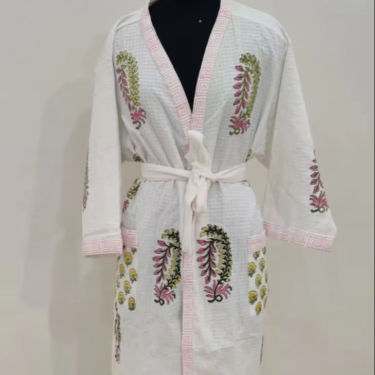 Lightweight Waffle Cotton Bathrobe with Floral Print Quick Absorb & Waist Tie for Casual or Party Wear in Spring