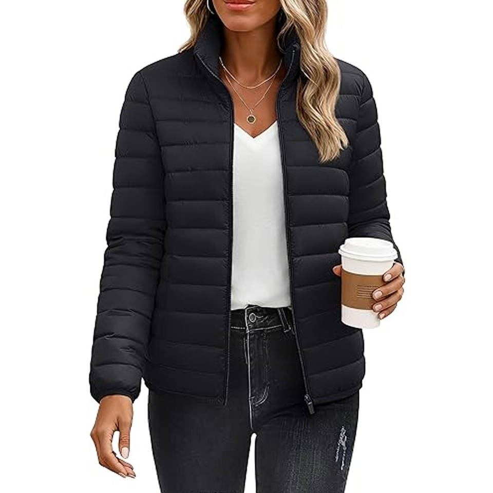 Lightweight Women Quilted Puffer Jacket Warm Winter Coat with Stand Collar Full Zip Comfortable Daily Outerwear Black Color