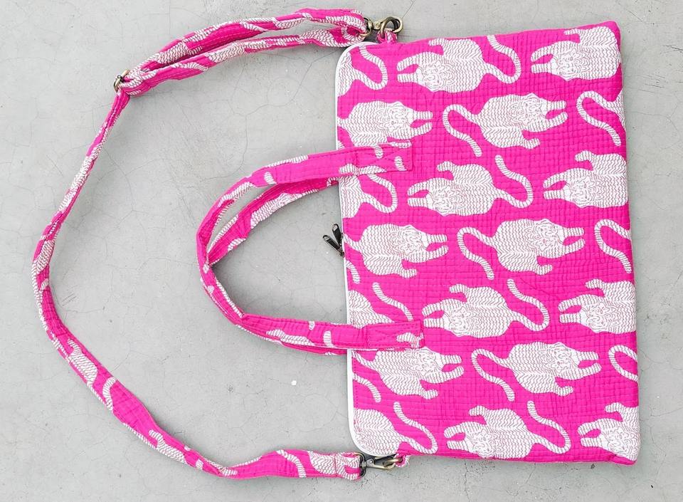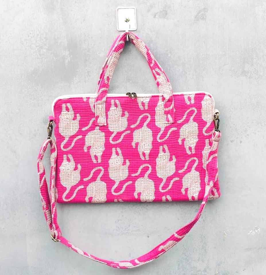 Lightweight for Pink Tiger Print Cotton Quilted Laptop Bag with Handle Waterproof Vintage Business Style Simple Office