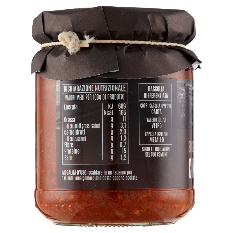 Boar meat, wine, pepper, tomato pulp, salt, carrots, onion, celery, beef, garlic, double tomato concentrate, extra virgin olive oil, laurelIngredients