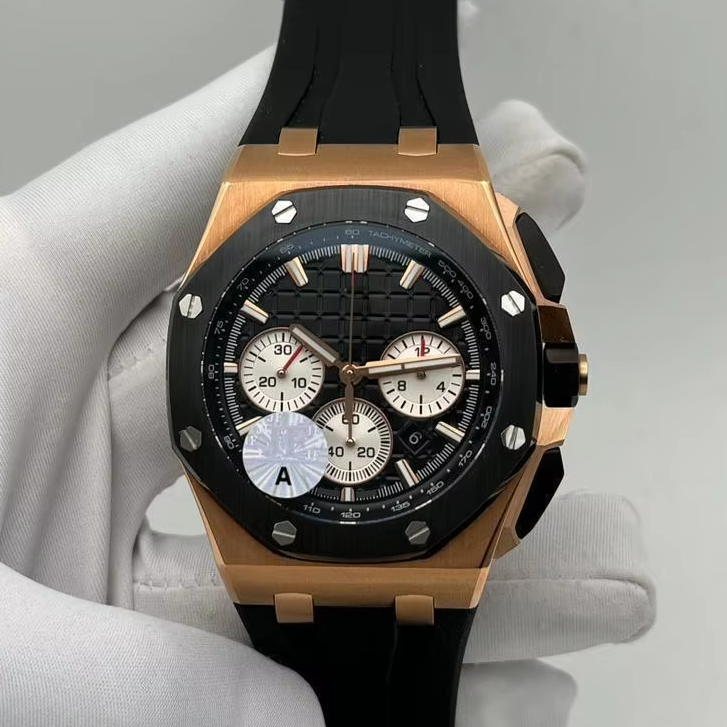 Limited Edition Luxury Street Rose Gold Tone Chronograph Watch Black Textured Dial Bezel Date Display Rubber Strap ETA Automatic