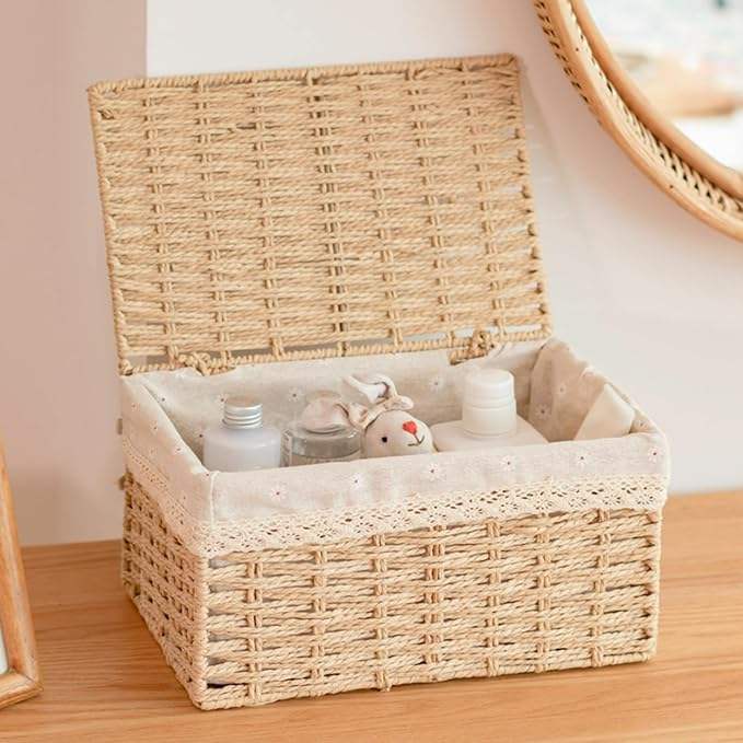 Lineroad Wicker Basket with Lid Paper Rope Decorative Storage Bin for Closet Makeup Organizer with Liner Bedroom Shelf Organizer