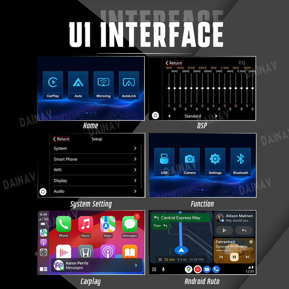 CarPlay, android auto, Bluetooth-enabled, Build-in DSP, MP3/MP4, Touchscreen, Photo Viewer, Radio Tuner, Remote Control, Voice Guidance, Steering Wheel Control, Split Screen, Reversing Aid, MultiMedia Supported, Build-in Microphone, App download from play storeFunction