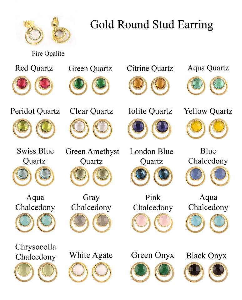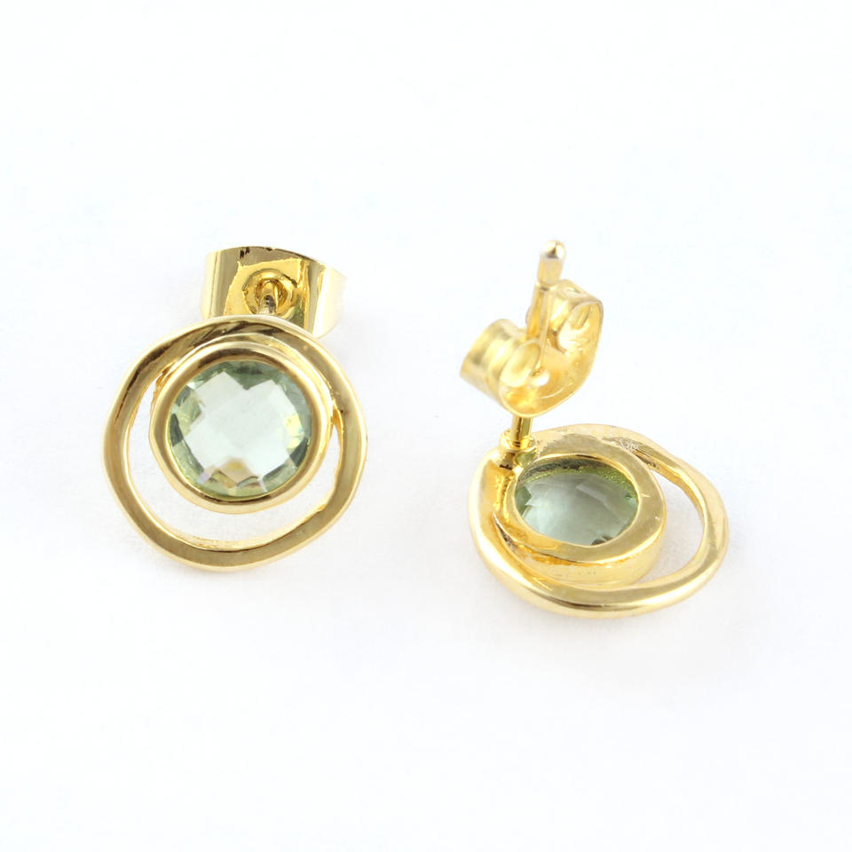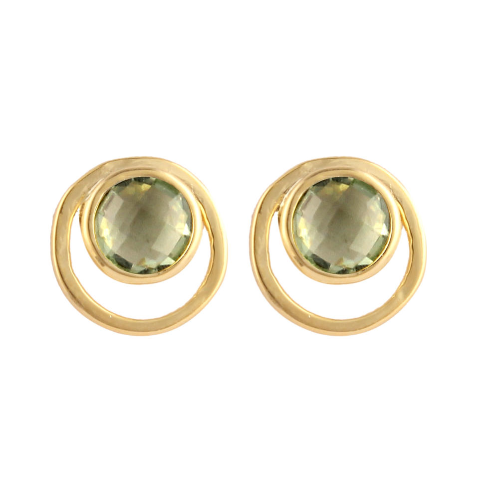 Lite Green Gemstone Earring Round Shape Design Amethyst Quartz Collet Setting Ear Post Stud Brass Gold Plated Casual Wear Studs