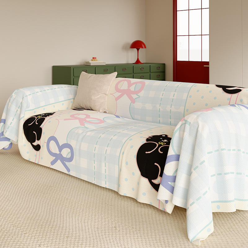 Little Black Cat With Bow Sofa Cover Printed Elastic Stretch Imitation Linen Pad Type Machine Wash Modular Sofa Slipcover