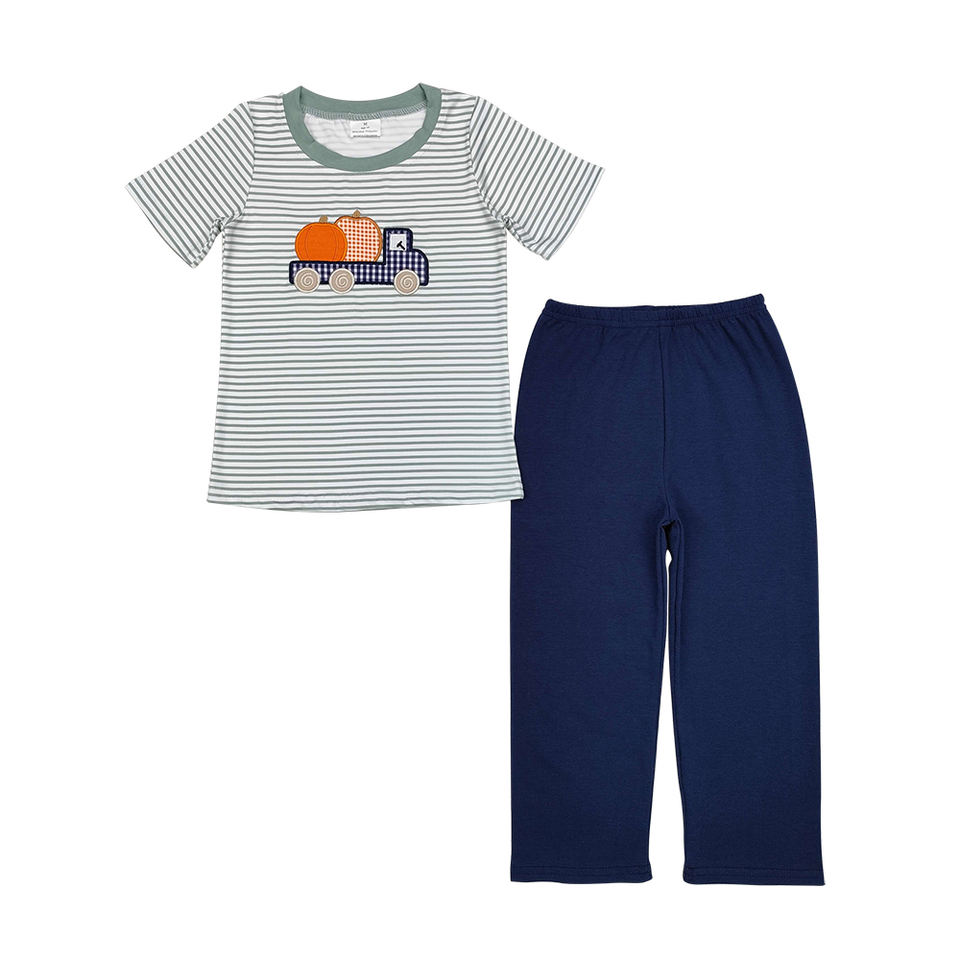 Little Boy Boutique Green stripe pumpkin truck embroidery fall outfits wholesale toddler boy short sleeve child clothing set