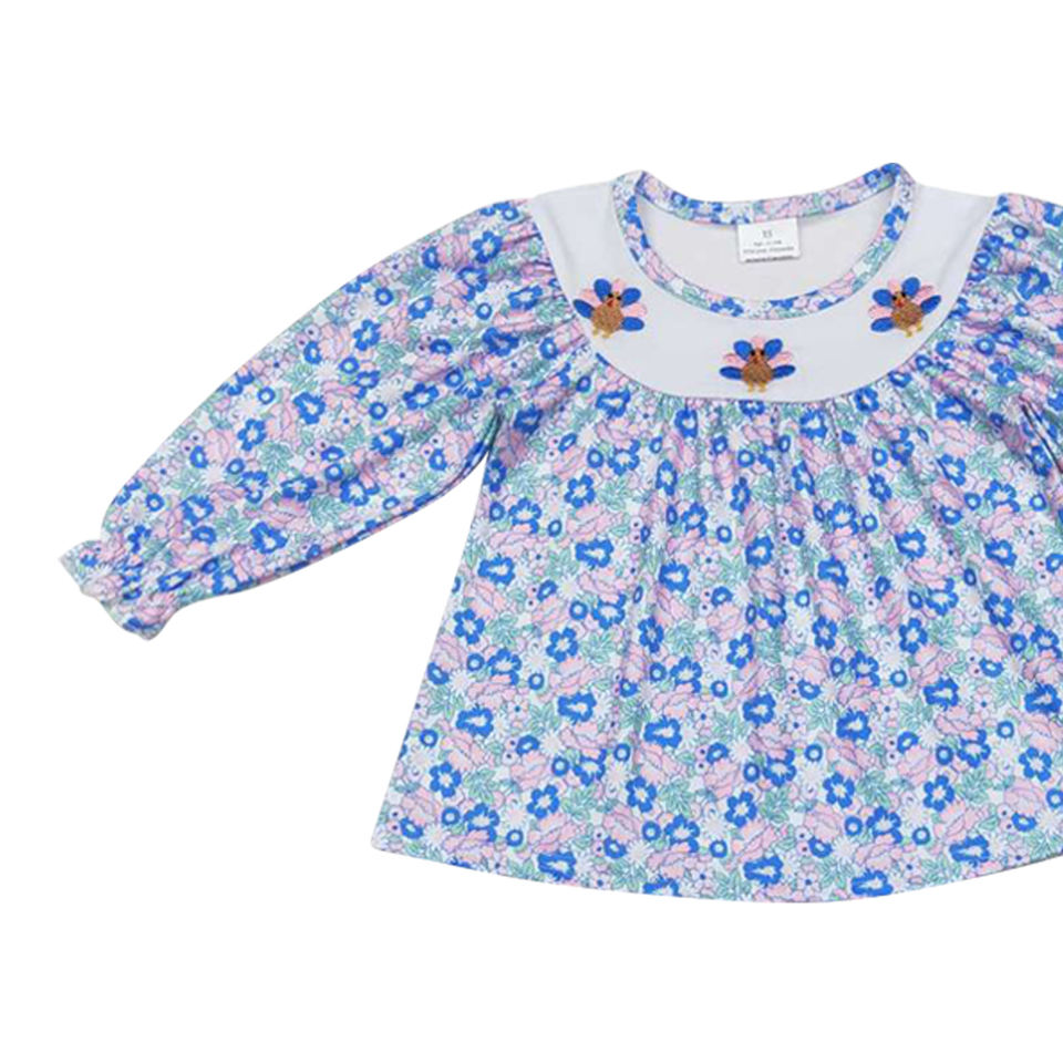 Little Girl Boutique Casual Clothing Set blue flowers turkey embroidery fall Outfits Kids Toddlers Wholesale Child Sister set