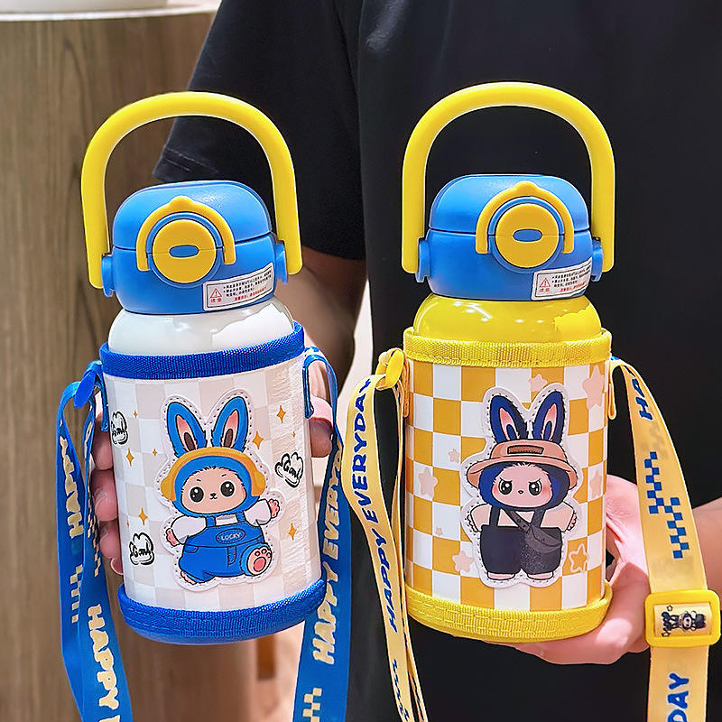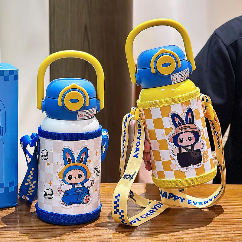 Locky Kids Insulated Water Bottle 500Ml Double Wall Vacuum Flask With Strap Cartoon Design For Children School Use