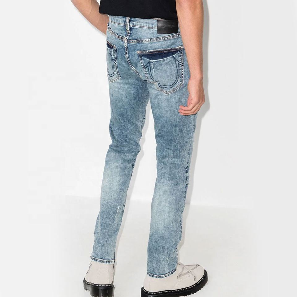 Logo Non Ripped Stretch Denim Cargo Men Pant 2021 Custom logo Blue Jeans Casual Straight Leg Zipped Hole Elastic Two Pockets Man
