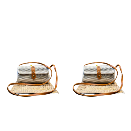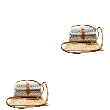 Lombok Handwoven Real Leather Strap Crossbody Bag Stylish Ethnic Wicker Craft Accent in Grey White Gradient Rattan Design