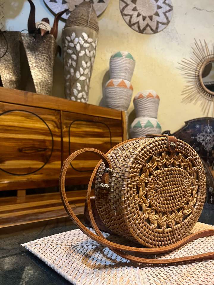 Lombok Traditional Indonesian Craft Handwoven Oval Gendit Rattan Crossbody Bag with Leather Strap Wicker Crafts