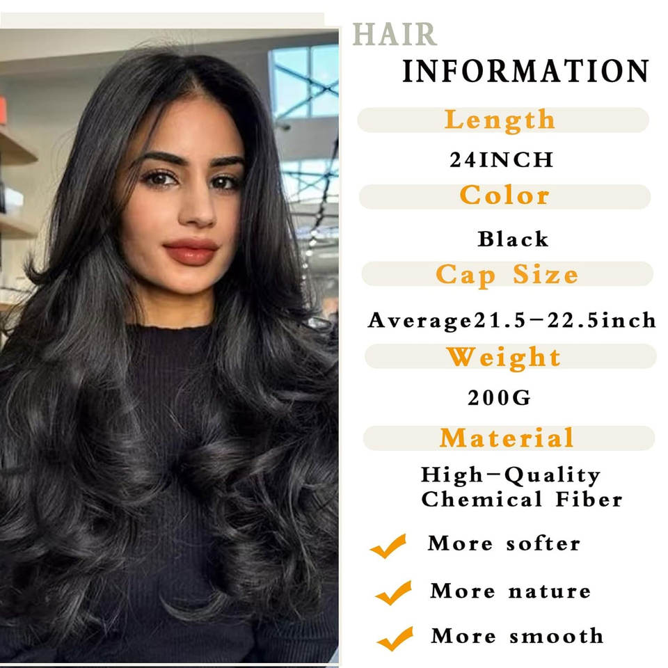 Long Curly Wavy Wig with Curtain Bangs Dark Brown Highlight Synthetic Hair for Women Perfect for Daily Style and Special Black
