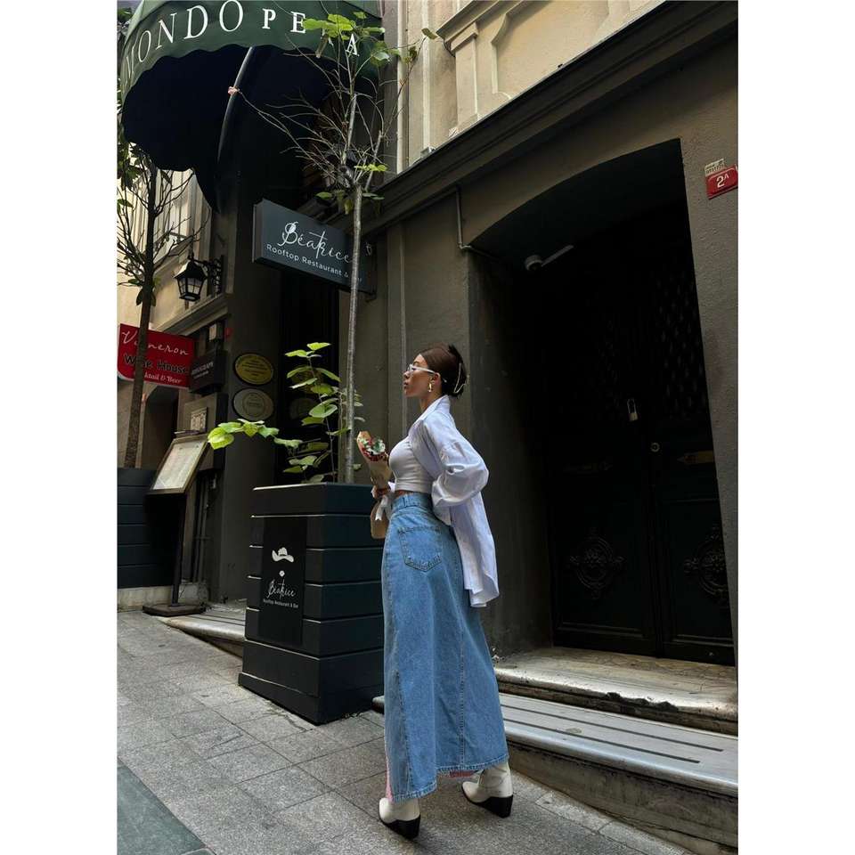 Long Denim Skirt Front Slit Pink Asymmetric Print Casual Formal Style Button Decoration Light Washed A-Line for Summer Autumn