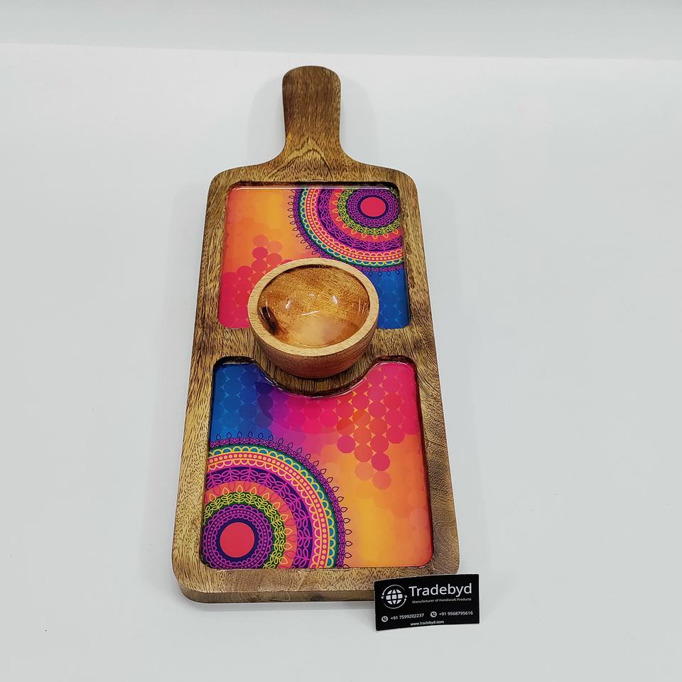Long Rectangular Enamel-Printed Mango Wood Serving Platter with Handle & Chutney Bowl Tradebyd