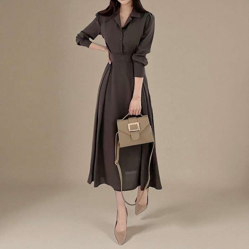 Long Sleeve Cotton Midi Dress for Women Button Front Polo Collar Dress Casual Everyday Outfit Modest Fall Spring Dress
