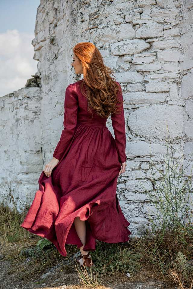 Long Sleeve Linen Maxi Dress, Burgundy Kaftan V Neck Maxi Dress Available Big Size Plus Size Bohemian Clothing At OEM ODM